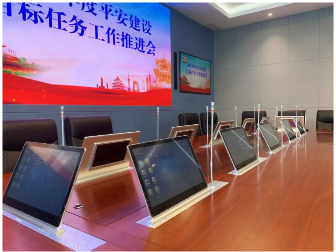 在12人的會議圓桌這里,安裝了12套WZH-L2LM 15.6"嵌入升降式無紙化終端,帶有電子桌牌和升降鵝頸發言話筒。它們具有銘牌顯示、文件批注、同屏廣播、分組廣播、異步瀏覽、跟蹤主講、外接信號顯示、臨時文件、主席控制等多種強大的功能;支持一鍵切換到Windows桌面,將Windows或其他軟件的操作界面同屏顯示到其它無紙化終端和大屏幕。
