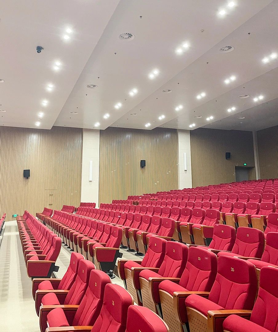 大型多功能報(bào)告廳可容納600余人,空間較大。要求多功能報(bào)告廳可滿足各類培訓(xùn)、學(xué)術(shù)報(bào)告、研討交流會(huì)等大中型會(huì)議及大中型文藝演出等多種使用需求,能滿足會(huì)議討論、發(fā)言等語言擴(kuò)聲使用功能,確保整套擴(kuò)聲系統(tǒng)聲音飽滿通透,人聲清晰自然。