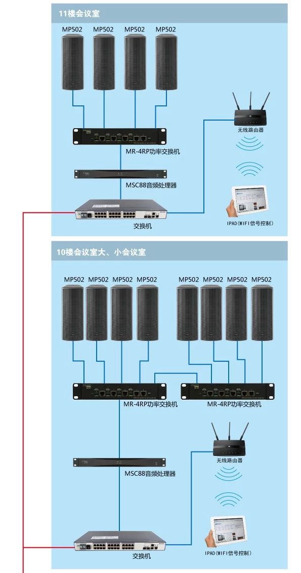 在此次項目設計中,工程商選用了Mission Pro MP全頻系列中的MP-502作為會議室和多功能廳的主擴揚聲器。MP-502為雙5.5寸有源壁掛音箱,內置Dante與D類功放模塊,通過一根網線進入系統MR-4RP功率交換機;MR-4RP通過網線連接MSC-88音頻處理器,最終通過網線連接主交換機,無需輸出模擬信號,通過Dante網絡傳輸協議進行數據處理。整座大廈采用了整合性極高的多功能分布式云控制系統