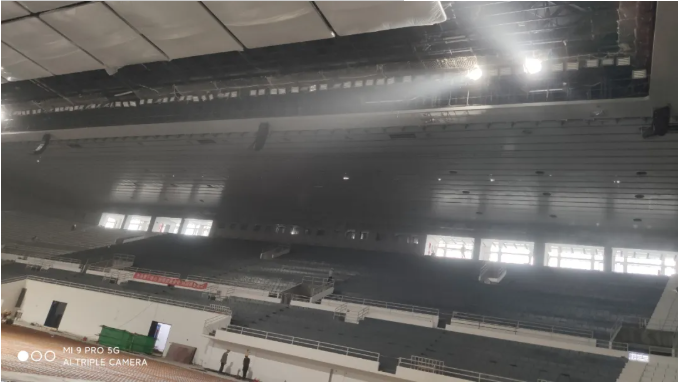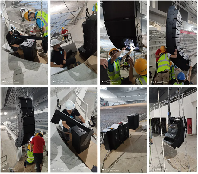 天博國際有限公司現場總負責人林社麟先生說道:“我們現場進行安裝工作的時間十分有限,因此我們在地面上把線陣列音箱組裝起來,并按照模擬軟件NS-1計算出來的角度和方向,調整好每個音箱,再把音箱吊掛到離地面十多米的位置固定好。再通過Dante網絡在電腦上使用NeMo軟件遠程操控。將音量,增益,延時,分頻點及輸出跳線設置好,并對音箱進行檢查。最后這個體育館具有聲壓均衡且高清晰度的效果。”