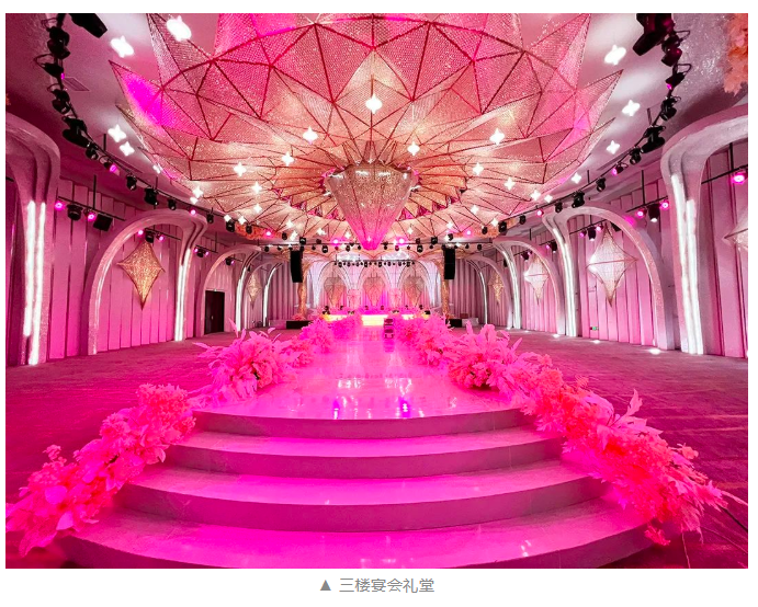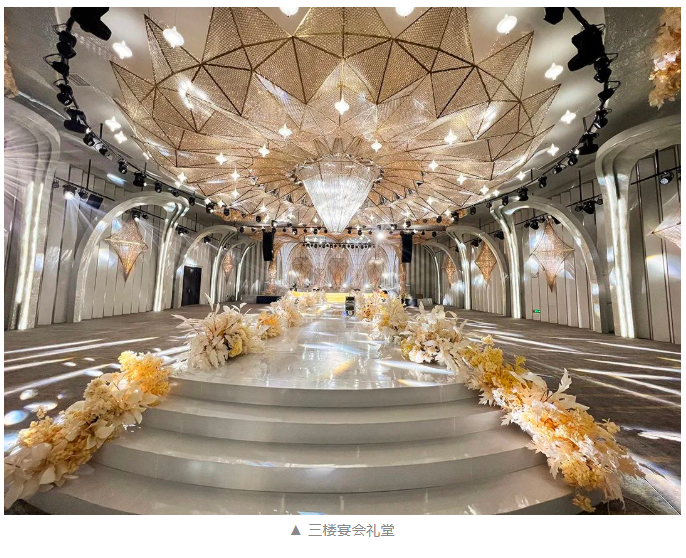 藝術宴會中心三樓宴會禮堂面積900㎡,層高6m且寬闊無柱式建筑設計,可容納500人,奢華的施華洛世奇水晶裝飾,猶如綴著無數顆寶石般的星辰,向賓客訴說著一種莫忘初衷,美好永存的美妙寓意。