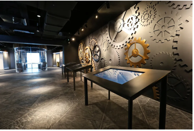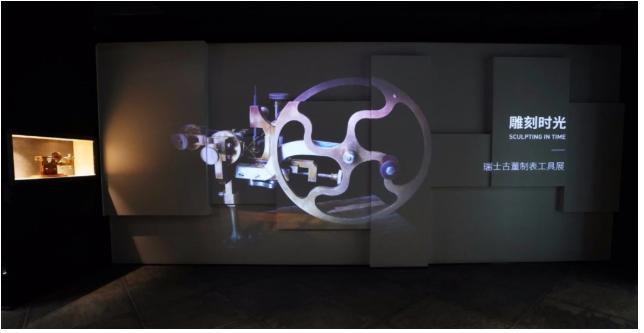 二層為鐘表文化體驗展廳,該展廳由五個部分組成:臨展區(qū):預留投影面、展柜位等空間,滿足臨時主題展覽靈動可變的展示需求。多媒體互動區(qū):通過聲光電一體化的多媒體系統(tǒng)介紹腕表的歷史與設計演變。手表材料與機芯展示區(qū):通過空間沉浸式造景設計對手表機芯及手表不同結構材料進行展示。機械互動體驗區(qū):通過空間造景和多媒體展示,打造虛實結合的體驗場景來介紹手表機械裝置和工藝。手作體驗區(qū):手表拼裝體驗。