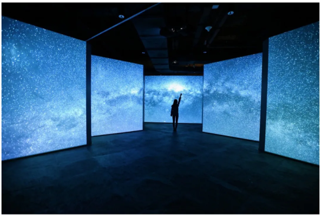 其中“五聯(lián)屏時空穿越廳”,展現穿梭時空的震撼,引出時間的產生與意義。通過上下三臺CB-L1060投影鐘表的鏈條,展示飛亞達表的文化和歷史。利用佳能投影機獨有的自帶0.54:1的鏡頭,通過有限的空間,展示出大畫面和細膩的圖像,還原飛亞達的鐘表歷史,詮釋出歷史與未來的演變。