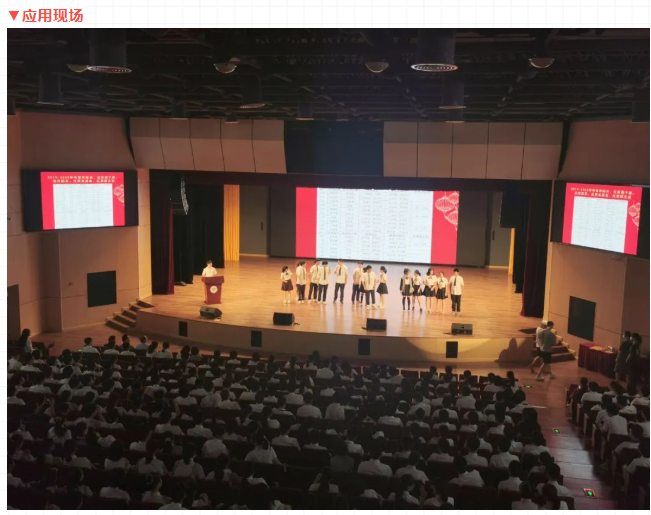 校區大禮堂是學校舉行會議、學術報告、培訓活動以及慶典演出等的綜合用途廳堂。為滿足使用要求,在禮堂配置了包括如下系統:擴聲系統、燈光系統、視頻系統、錄直播系統以及會議中控系統等。項目自投入使用以來,承接了多場活動,包括:家長會、高考動員大會、教師節演出等。