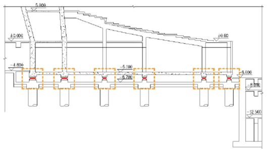 其次,歌劇廳建造時(shí)需要對(duì)地基作特別處理以消除結(jié)構(gòu)傳播噪聲(ground-bornenoise),即附近地鐵、路面交通等振動(dòng)帶來(lái)的噪音。圖中黃色虛線框起的阻尼器將結(jié)構(gòu)震動(dòng)帶來(lái)的動(dòng)能轉(zhuǎn)化為熱能,加速垂直方向振動(dòng)頻率的衰減,從而降低噪聲影響。