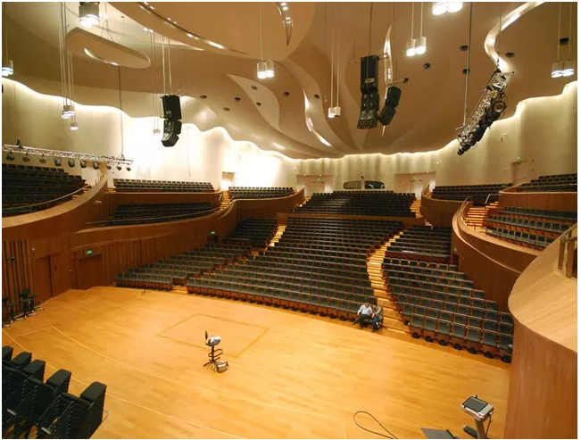 例如,江蘇大劇院音樂(lè)廳就主要采用的是線陣列擴(kuò)聲器,在場(chǎng)地較小、輔助擴(kuò)聲器較少的情況下也能覆蓋所有觀眾席位。