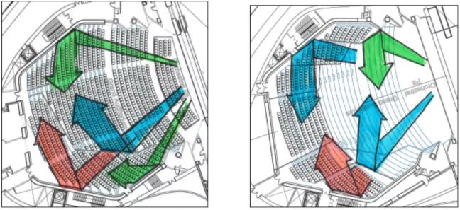 下圖是歌劇廳的一階反射聲,即聲音從舞臺(tái)擴(kuò)聲器發(fā)出后經(jīng)過(guò)第一次反射的路徑分析。從各個(gè)箭頭的指向與長(zhǎng)度可以看出,聲音到達(dá)各區(qū)域座位距離、時(shí)間相當(dāng),也就是各區(qū)域觀眾都能有相似的聽(tīng)覺(jué)體驗(yàn)。