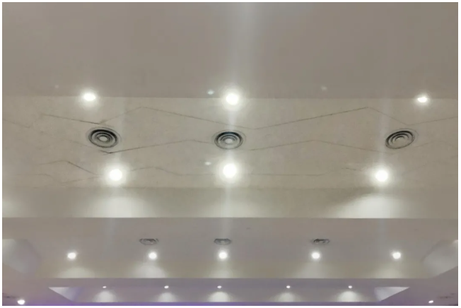 考慮到高層觀眾離天花更近,回音影響更大,在騎樓、高層處的天花與墻面需要更強(qiáng)的吸音效果。設(shè)計(jì)師巧妙地將空調(diào)回風(fēng)口與燈架一起設(shè)置在天花板與兩側(cè)上方,既完成了座椅下送風(fēng)、頂棚回風(fēng)的節(jié)能空氣處理系統(tǒng),又通過(guò)凹凸不平的墻面削弱了回聲。