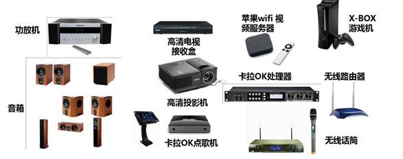 1)投影機(jī)、高清藍(lán)光播放機(jī)、點歌機(jī)、互動游戲機(jī)、高清電視機(jī)頂盒、卡拉OK機(jī)、無線話筒、功放機(jī)、空調(diào)機(jī)、網(wǎng)絡(luò)路由器等等多達(dá)十幾種設(shè)備;