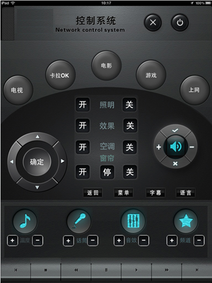 它將帶您進(jìn)入真實7.1聲道的私人高清影院世界;它會幫您調(diào)暗燈光、關(guān)閉效果彩燈、音視頻切換到藍(lán)光播放機(jī)、擴(kuò)聲系統(tǒng)調(diào)整到最佳電影效果、、、您一樣可以在IPAD上輕松自如的管理音量大小及靜音。
