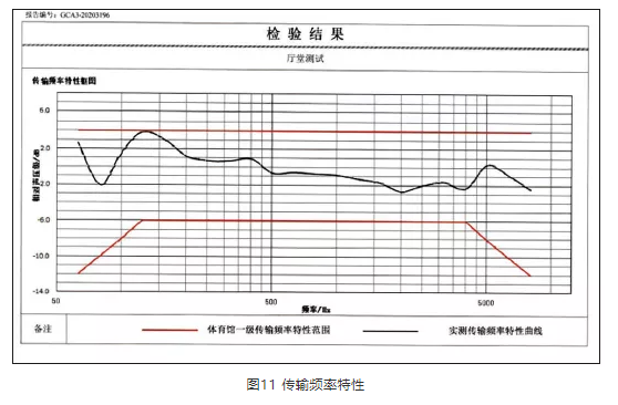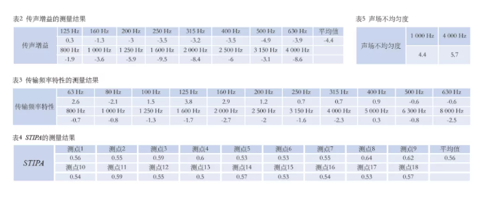 施工完畢后,進(jìn)行了現(xiàn)場(chǎng)實(shí)測(cè),測(cè)點(diǎn)如圖10所示。經(jīng)現(xiàn)場(chǎng)測(cè)試,擴(kuò)聲系統(tǒng)聲壓級(jí)可基本達(dá)到設(shè)計(jì)值,其他測(cè)量結(jié)果見圖11、表2—表4。測(cè)試結(jié)果反映,該項(xiàng)目達(dá)到設(shè)計(jì)目標(biāo)及行業(yè)相關(guān)標(biāo)準(zhǔn)指標(biāo)。
