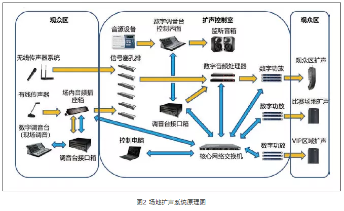 擴(kuò)聲系統(tǒng)的總體改造方案,系統(tǒng)的音頻控制、傳輸通過Dante網(wǎng)絡(luò)構(gòu)建數(shù)字加模擬的混合網(wǎng),場(chǎng)館內(nèi)所有音頻信號(hào)均匯聚到音頻控制機(jī)房進(jìn)行分發(fā)。數(shù)字調(diào)音臺(tái)同樣采用一主一備,主調(diào)音臺(tái)可搬至場(chǎng)內(nèi)進(jìn)行現(xiàn)場(chǎng)調(diào)控,并在主席臺(tái)區(qū)預(yù)留音頻接口箱,可接入有線傳聲器、無線傳聲器系統(tǒng)。系統(tǒng)使用時(shí),需要根據(jù)不同賽事的使用場(chǎng)景對(duì)數(shù)字調(diào)音臺(tái)以及功率放大器進(jìn)行預(yù)設(shè)。系統(tǒng)基本框架如圖2所示。