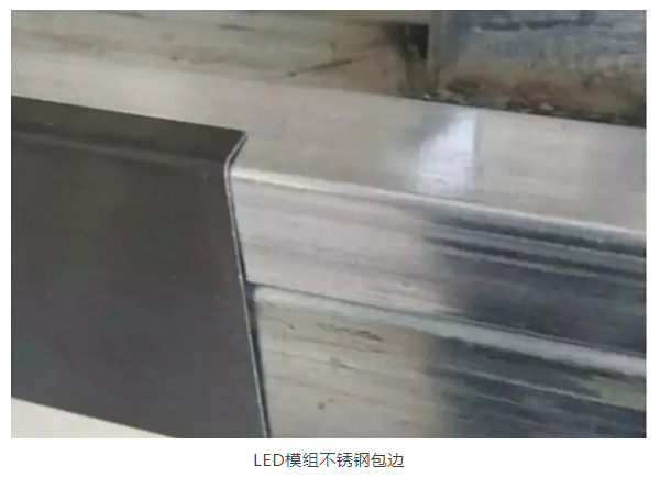 裝模組之前要用不銹鋼包邊,這僅僅是為了好看,也是安裝單位要求的,專門找來了做不銹鋼的師傅來量了尺寸,估算了下他量完鋼結(jié)構(gòu)后加大了5mm吧,為方便能好安裝又能卡死不銹鋼包邊。這里因為屏幕尺寸不大,我們提前安裝的不銹鋼包邊,有時也可以在屏幕安裝完后再安裝不銹鋼包邊,但是要注意的就是底部第一排水平一定要做好。