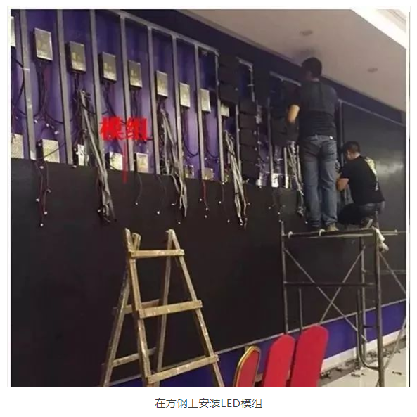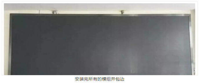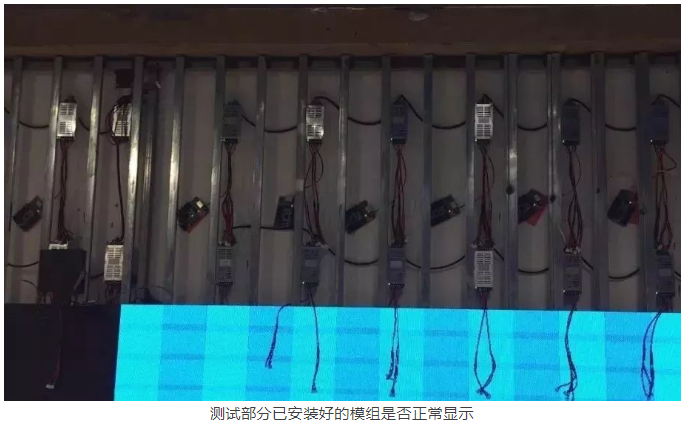 扣好不銹鋼邊后就能開紿上模組了。模組建議從下往上裝,從中間往兩邊開始安裝。這樣的安裝方式有很多爭議,從底部安裝主要是為了使水平和垂直都能在正常控制范圍內(nèi),特別是屏幕的面積大了以后,更加容易失控,特別是小間距的要求超高,有點縫隙沒有達(dá)到要求,都需要做精細(xì)的調(diào)整。