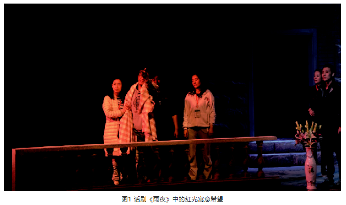 紅色的燈光寓意希望,筆者習慣把它叫作“希望之光”,在筆者參與創作的劇目中多有運用。在話劇《雨夜》中,就用了一束紅色光給趙明以希望,這也是社會 的希望和民族的希望。劇中趙明和杜海是中學同學,趙明聰明、正直,大學畢業后做了一名中學老師,教課很好但不愿意同流合污,最后辭職下海。在危難的時候副市長杜海救了他,杜海是他的恩人,從此他成了杜海的左膀右臂,幫杜海干了好多違法的事情,用他自己的話說,他就是杜海的一條狗。趙明的正直使他一直糾結、痛苦,他不能違背做人的底線和良心,所以,在查出得了絕癥后,他決定揭露杜海的罪行,勸其去自首,他不能把那些罪惡帶到棺材里。在同學聚會時,趙明又苦口婆心地勸杜海,杜海根本聽不進去,兩人矛盾加劇,趙明憤然離場。此時由于矛盾激化室內光是偏冷的暖光,室外下著雨,是淡淡的藍色光,趙明沖到室外,由暖光區進入冷光區,他站在那里悲憤地說:“做了狗的人不能到死還是一條狗啊!我要做一次人,我不相信天永遠是黑的,我要讓它再亮一次!”隨著趙明的這句臺詞,從上場門耳光處一束紅色光慢慢地照在他身上,室外的冷光也慢慢轉暖。天亮了,寓意著趙明的希望一定能夠實現。見圖1。