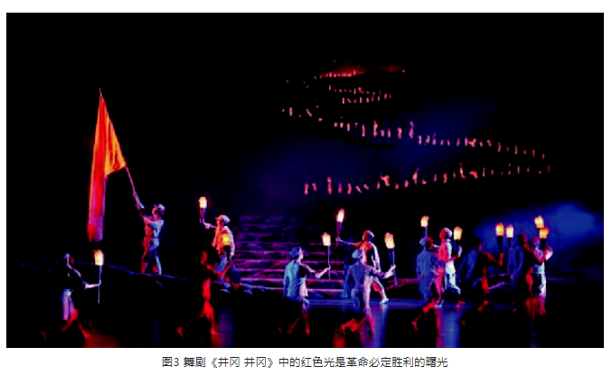 舞劇《井岡 井岡》也用了紅色光,同樣預示希望和曙光。當反圍剿失敗后,紅軍進行了戰略轉移,上場門吊籠處一束紅色光照耀在戰士們的臉上,在藍色光中格外溫暖。紅色光是失敗時的希望之光,是戰士們沒有被困難嚇倒,滿懷革命熱情堅信革命必定勝利的曙光。舞臺上的藍色基調是夜晚和革命失敗的環境光,在藍色的基調中,戰士們迎著紅色光漸漸地走遠了,遠處是一條由火把組成的紅色之字形亮線,象征著星星之火可以燎原,中國共產黨的火種傳遍祖國各地。見圖3。