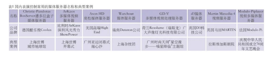 表1列出國(guó)內(nèi)表演控制常用的媒體服務(wù)器名稱和典型案例。