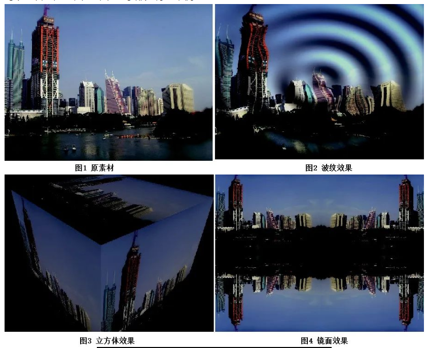 2)即時(shí)特效和轉(zhuǎn)場(chǎng)疊化:基本的位移、旋轉(zhuǎn)、縮放功能;對(duì)視頻素材隨機(jī)增添字幕、數(shù)字和動(dòng)畫效果,添加淡入淡出等轉(zhuǎn)場(chǎng)效果并實(shí)時(shí)剪輯;其特效庫(kù)擁有160種以上的影像特效,50種以上的文本動(dòng)畫(原始素材),包括色調(diào)特效、波紋效果、球體效果、立方體效果、鏡面效果、分屏效果、視頻分裂效果、多屏、寬屏的邊緣柔化以及“門”的開合動(dòng)畫等影像特效。這些效果還可以組合疊加。圖1~圖5顯示部分特效案例。