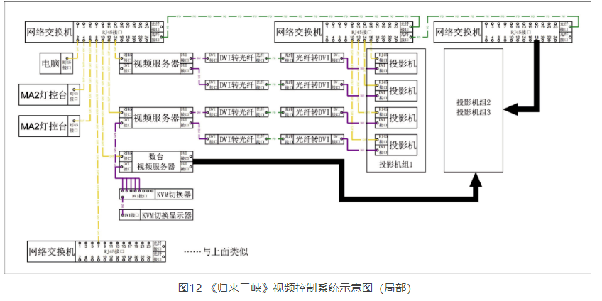 2)兩臺(tái)MA2燈控臺(tái)和16臺(tái)視頻服務(wù)器提供視頻素材、投影特效和控制功能,與音響及燈光系統(tǒng)同步運(yùn)行。見圖12。