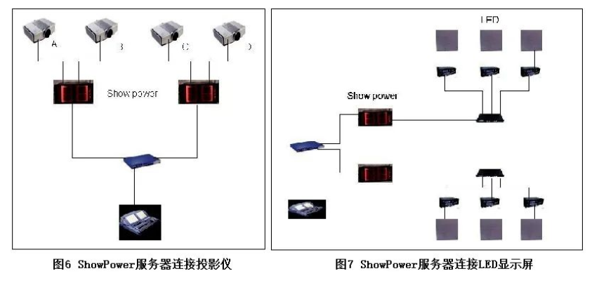 圖6和圖7分別示意了ShowPower服務(wù)器與投影儀與LED屏幕的連接。