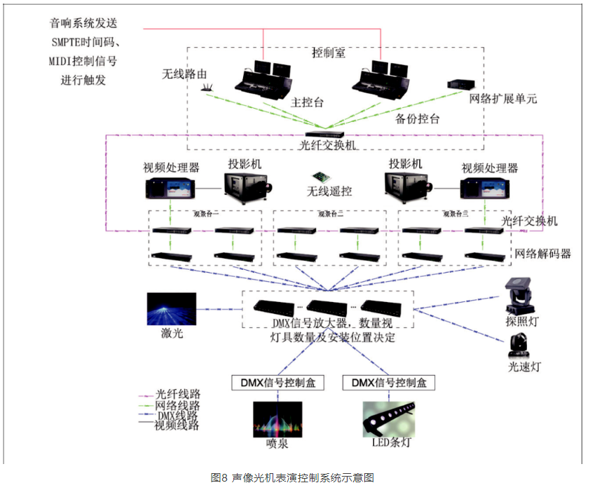 目前常用的聲像光機(jī)表演控制系統(tǒng)以燈光音視頻機(jī)械等各控臺(tái)為中心、時(shí)間碼為同步信號(hào)的方式,將燈光、音響、視頻和機(jī)械跟隨演出同步推進(jìn)。本文主要分析采用運(yùn)行DMX、MIDI、SMPTE等多種協(xié)議,控制常規(guī)燈具、電腦燈具、音響、投影、LED屏、噴泉、焰火、激光和機(jī)械(如冰屏或恐龍)動(dòng)作等同步運(yùn)行表演。該控制模式靈活可靠,有較廣泛的應(yīng)用。