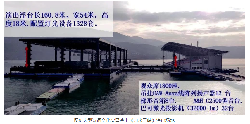 由張藝謀主持創(chuàng)作的大型詩(shī)詞文化實(shí)景演出《歸來三峽》,地點(diǎn)在重慶市奉節(jié)縣三峽西端入口夔門,2018年12月首演。演出浮臺(tái)160 m,寬54 m,高18 m。觀眾席1 800座。見圖9。節(jié)目選取了李白、杜甫、劉禹錫、蘇軾、陳子昂和李商隱等6位詩(shī)人的十首詩(shī)詞,預(yù)先通過音頻工作站將朗誦詞和配樂錄制貯存,演出時(shí)演員的動(dòng)作是跟隨音響系統(tǒng)重放預(yù)錄朗誦詞和配樂同步表演。整個(gè)系統(tǒng)是以音響為主線,由數(shù)字調(diào)音臺(tái)發(fā)出MIDI時(shí)間碼信號(hào),控制燈光、視頻和特效。