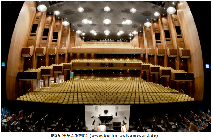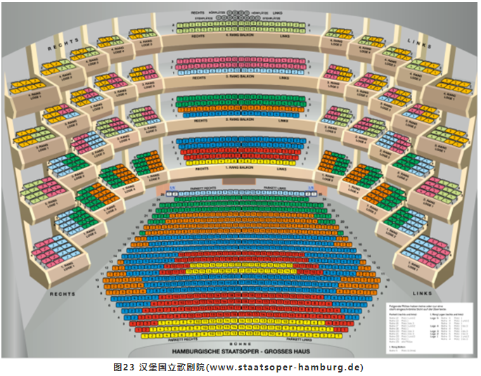 德國歌劇院曾經在20世紀中期,嘗試改進歌劇院側包廂視覺缺陷,將觀眾廳平面設計成六邊形,前半部分擴大(增加容座、為側包廂騰出視角)、后半部分回收(取消邊角不利位置、為后部側包廂內移提供墻體支撐)。側面的挑臺做成一個個略向前傾的雪橇形,層層跌落地朝向舞臺方向。這種“傾斜雪橇”的形式較好地解決了包廂的視線問題,但是觀眾廳前半部分的扇形特性直接導致池座的絕大部分區域缺少早期的側向反射聲。1955年重建的的Hamburg State Opera(漢堡國立歌劇院,見圖21、22)、1957年重建的科隆歌劇院(cologne opera,見圖23)和1961年重建的德國德意志歌劇院(Deutsche Oper,見圖24)都采取了“傾斜雪橇”的形式,但終因聲學上的缺陷而沒有在歐洲和世界上推廣開來。