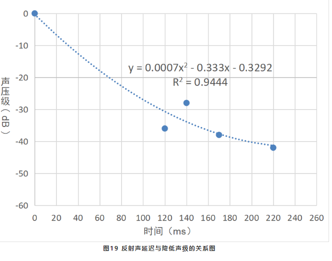 Nakamura等人(1991)[18]根據大量試驗認為:延遲時間為140ms的反射聲級應比直達聲低25~30dB(均按歌唱歌手前1m處測得)。Okano(1994)[6]一組女高音歌唱歌手來做試驗,請她們判斷墻面反射來的容許聲級為多少。對于延遲時間為120、170和220ms的反射聲,最敏感的歌唱家認為容許聲級在直達聲以下分別為36、38和42dB。根據這兩組數據繪制出反射聲延遲與降低聲級的關系圖18,可以看出不同的實驗對容許聲級還是有一定差別,需要在實踐中,根據演出團隊的需求進行適當地調整。