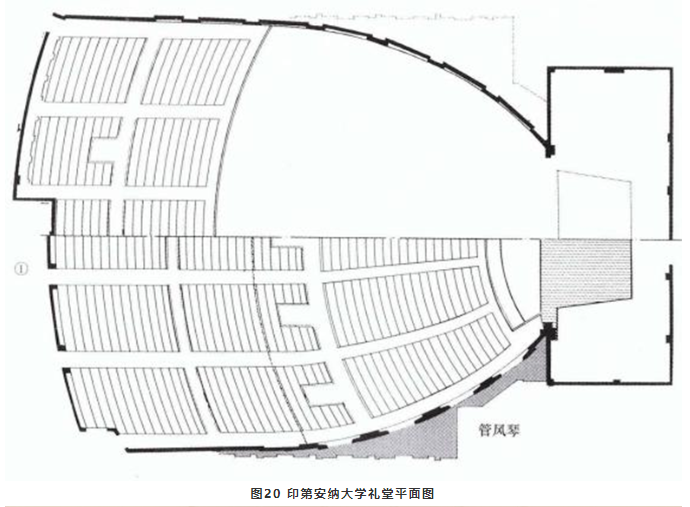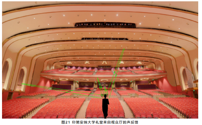 美國印第安納大學禮堂的平面圖見圖19,由于臺口側墻形狀呈內凹形,前中區的大量觀眾席肯定缺少早期側向反射聲,因此觀眾廳的音質效果并不太好。但是由于有來自池座后墻、挑臺欄板、側墻格柵邊緣以及頂棚上燈槽線腳的反射聲而產生出一種特殊的活躍感(見圖20)。歌手說禮堂對他們的歌聲有很好的支持;樂池中的指揮說整體感很好,樂隊也易控制。歌手和樂池中樂隊的平衡對大廳中大部分位置是滿意的。從印第安納大學禮堂的例子可以看出從表演者角度進行聲學設計是多么重要。