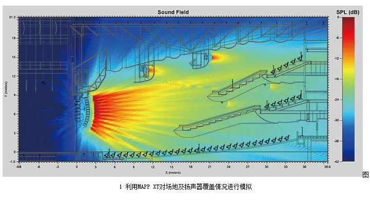 當獲得足夠的場地信息之后,需要利用揚聲器廠家提供的模擬軟件(或者通過Ease Focus這種基于GLL文件的通用設計軟件)進行建模,這些軟件可在可視化的條件下,實時調整并計算不同設計方案的覆蓋均勻度以及聲壓級分布,較為復雜的模擬軟件(如Ease)甚至可以將反射和墻面材質的吸聲特性都考慮在內,實現對反射情況的模擬(見圖1)。系統建模和預測的重要作用在于讓系統工程師在裝臺開始之前就能夠做好全部的計劃和準備工作,進而起到減少正式施工時長并提高工作效率的作用。