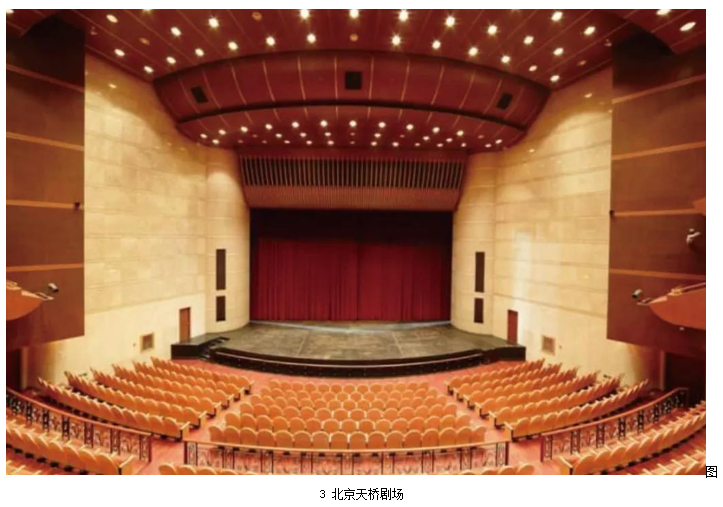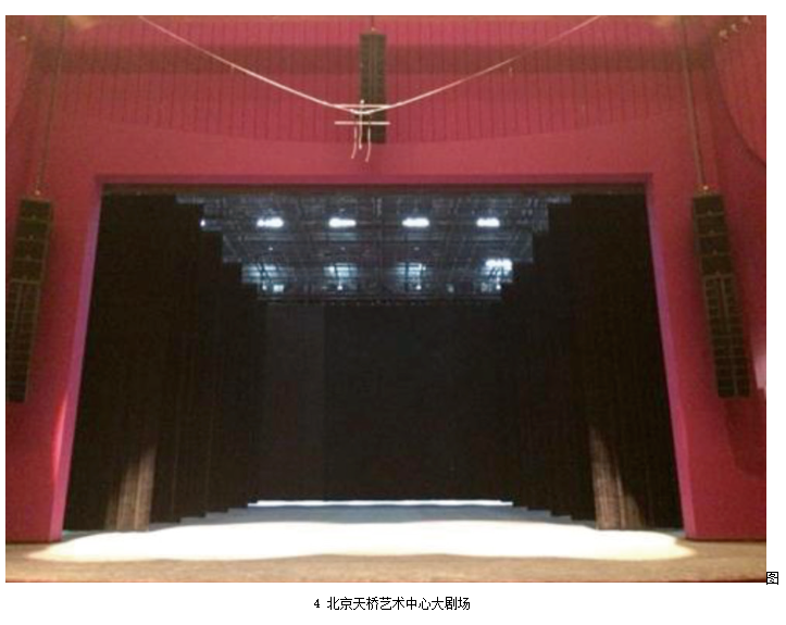 標準劇場中,中置揚聲器組的安裝通常分為暗裝和明裝兩種。暗裝一般是安裝在舞臺鏡框上沿預留的聲橋當中,如北京天橋劇場(圖3)。明裝則是吊掛在舞臺燈桿或預留的吊點上,如北京天橋藝術中心大劇場(圖4)。暗裝對觀眾的視覺影響最小,如果劇場擴聲系統設計合理,建筑聲學指標達標,且在鏡框高度不是很高的情況下,劇場中置聲道暗裝是最好的安裝方式。但是國內劇場的實際情況并不樂觀,且不同演出的系統工程師和音響設計師都有各自的設計和考量,暗裝中置聲道位置又基本不可調整,所以很多劇場中暗裝的中置聲道使用率很低。明裝的中置聲道更便于安裝、拆卸以及調整,更加適合流動性強的演出,因此,越來越多的現代化劇場采用這種安裝方式。