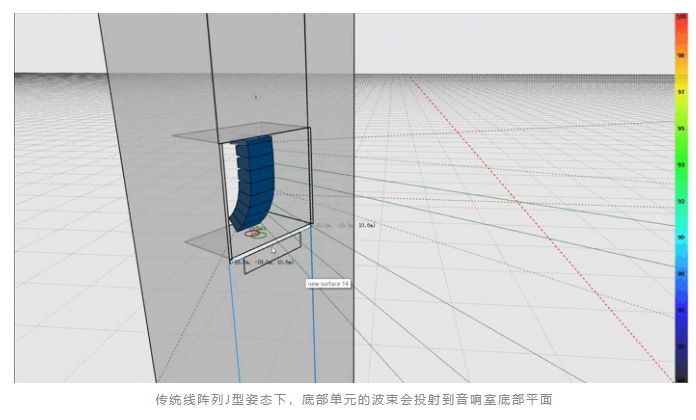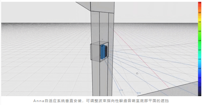 在暗裝的方式下音響室空間通常狹小緊湊。在本項(xiàng)目中,音響室的底部平面距離陣列僅10厘米。如果采用傳統(tǒng)線陣列的擴(kuò)聲系統(tǒng),陣列會形成J字型物理姿態(tài),不僅占用較大的安裝空間,J型底部的音箱單元還有可能將聲能投射到音響室的底部平面上,導(dǎo)致大部分高頻能量無法穿透出來,從而無法覆蓋到一部分前區(qū)的觀眾區(qū)。選用Anna,它的垂直吊裝方式既能節(jié)約了安裝空間,還能將高中低頻單元統(tǒng)一的盡可能靠近透聲幕,躲避音響室底部平面對波束的遮擋,最終實(shí)現(xiàn)幾乎全場的覆蓋。