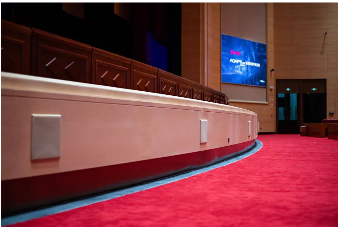 舞臺臺唇固定安裝了多只CMI5,為觀眾席前排座席補(bǔ)充中高頻響應(yīng)。CMI5是采用同軸設(shè)計(jì)的超緊湊兩分頻揚(yáng)聲器,可以提供優(yōu)秀的指向性控制和均勻一致的聽音體驗(yàn)。針對安裝位置過高,而造成的兩側(cè)主擴(kuò)揚(yáng)聲器覆蓋不足的情況,在左右八字墻大屏下方位置,固定暗藏了MKD896點(diǎn)聲源揚(yáng)聲器予以補(bǔ)充。